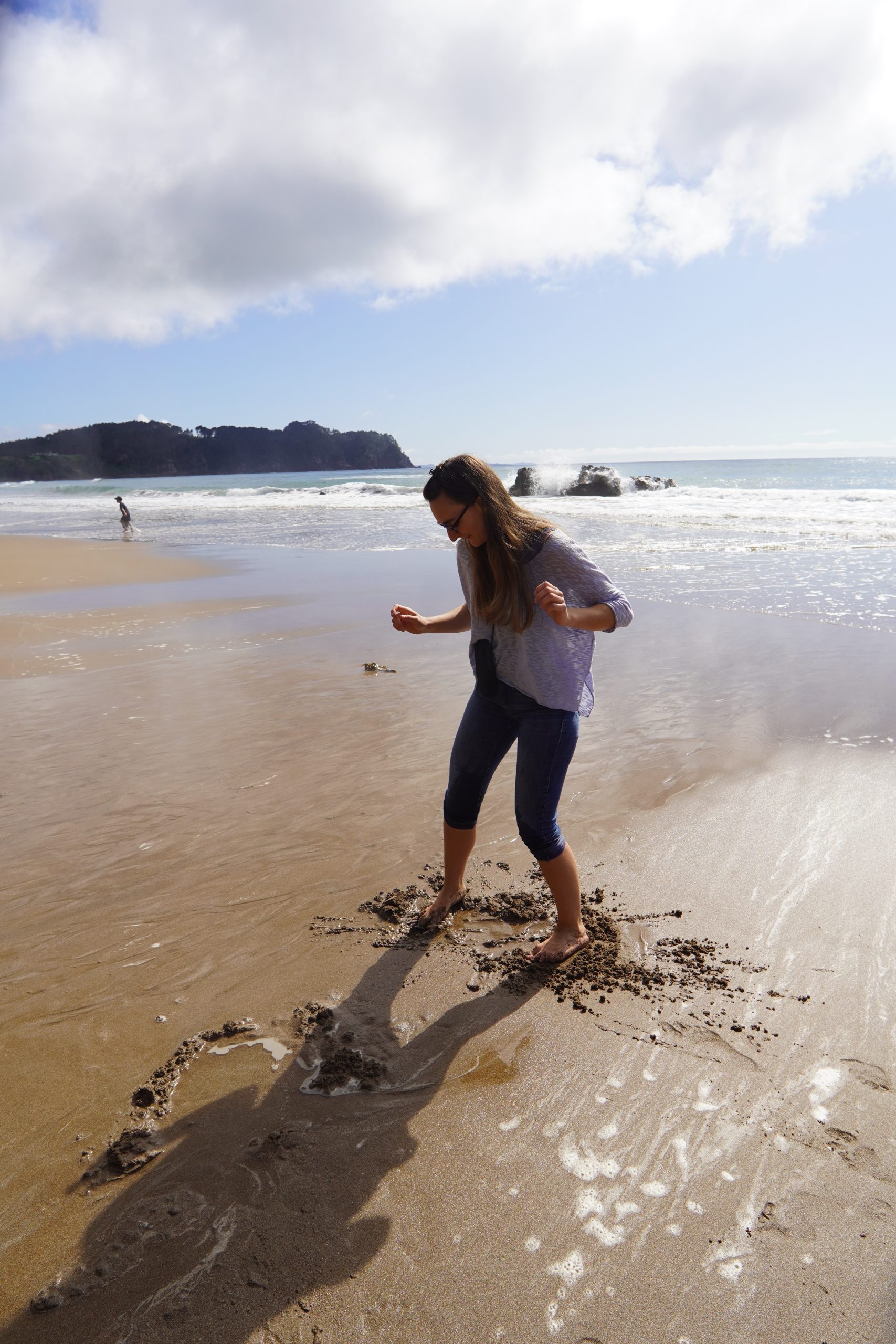 An unserem dritten Tag in Auckland machten wir eine Tagestour zur Coromandel-Halbinsel. Wir begannen mit dem Hot Water Beach. Wie der Name schon sagt, hat dieser Strand heißes Wasser unter sich, wirklich heiss. Man gräbt ein Loch zum heissen Wasser und lässt es sich mit dem kalten Meerwasser vermischen, um Verbrennungen zu vermeiden.