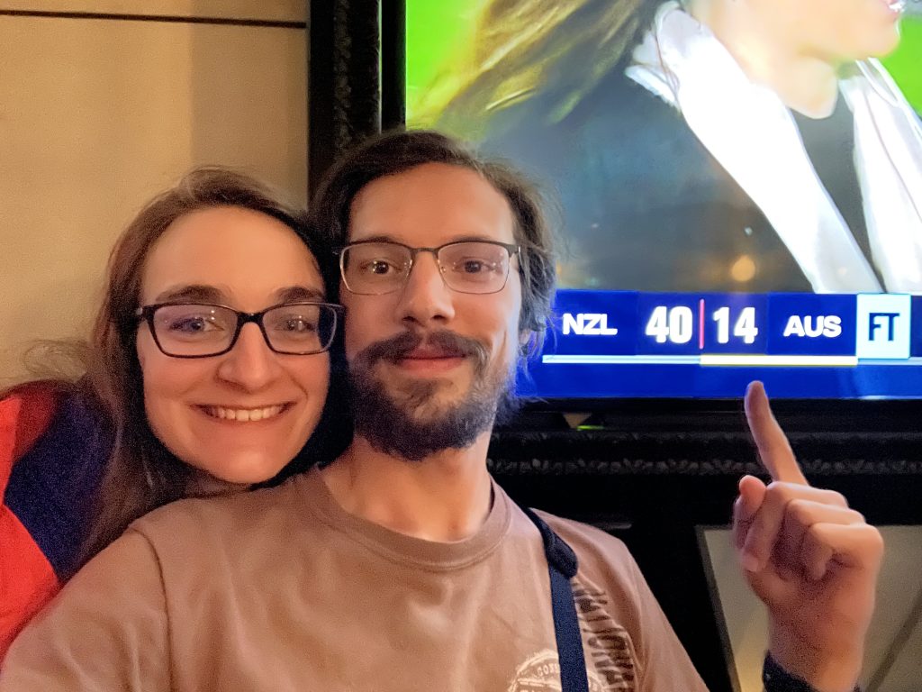 Am Abend sahen wir den glorreichen Sieg der neuseeländischen All Blacks gegen die australischen Wallabies in unserem ersten Rugbyspiel.