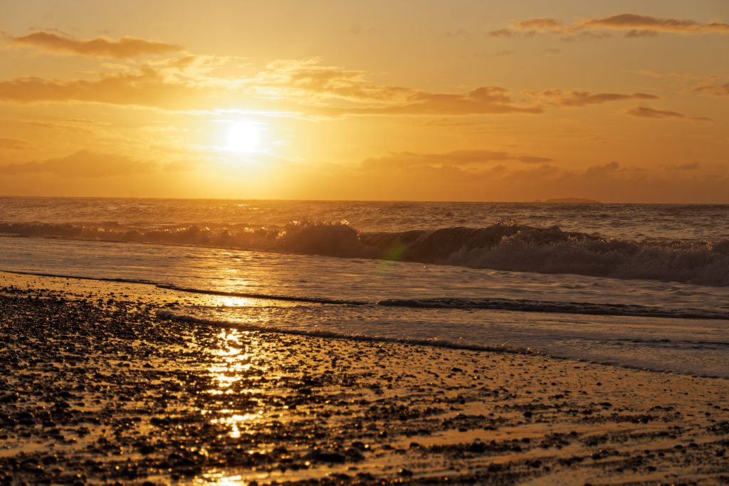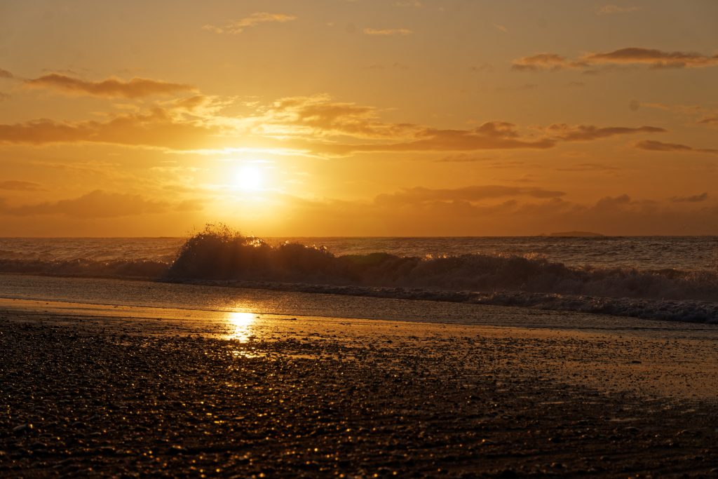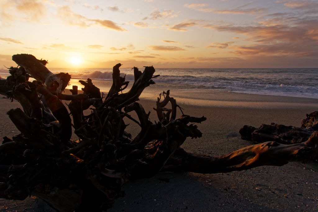 Schliesslich hatten wir das Glück, einen atemberaubenden Sonnenuntergang in Haast Beach zu erleben, nachdem ein starker Regenguss gerade noch rechtzeitig aufgehört hatte.
